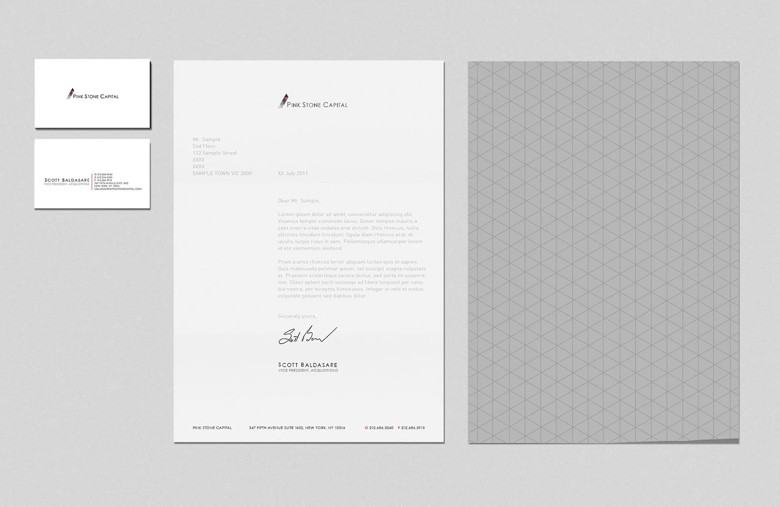 After creating the three brand pillars of Pink Stone and their consumer-facing identity, those ideals and iconography needed to be reinterpreted to design their parent company, Pink Stone Capital's corporate identity. Pink Stone Capital needed a cleaner and more professional look to speak to banks, investment firms and construction companies.