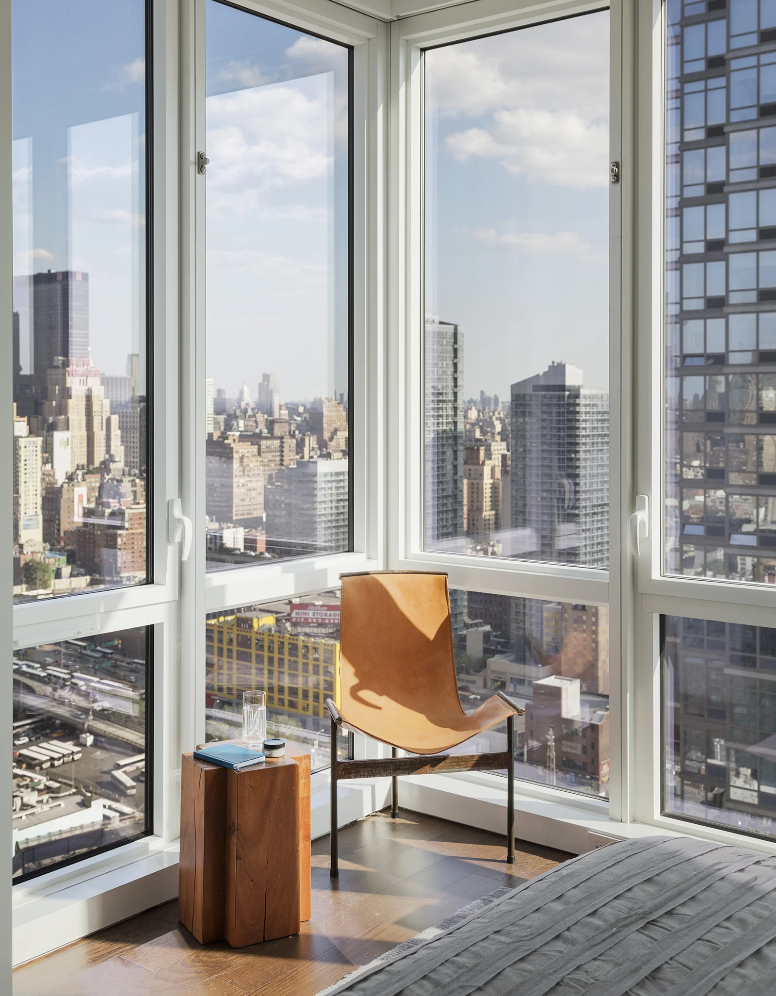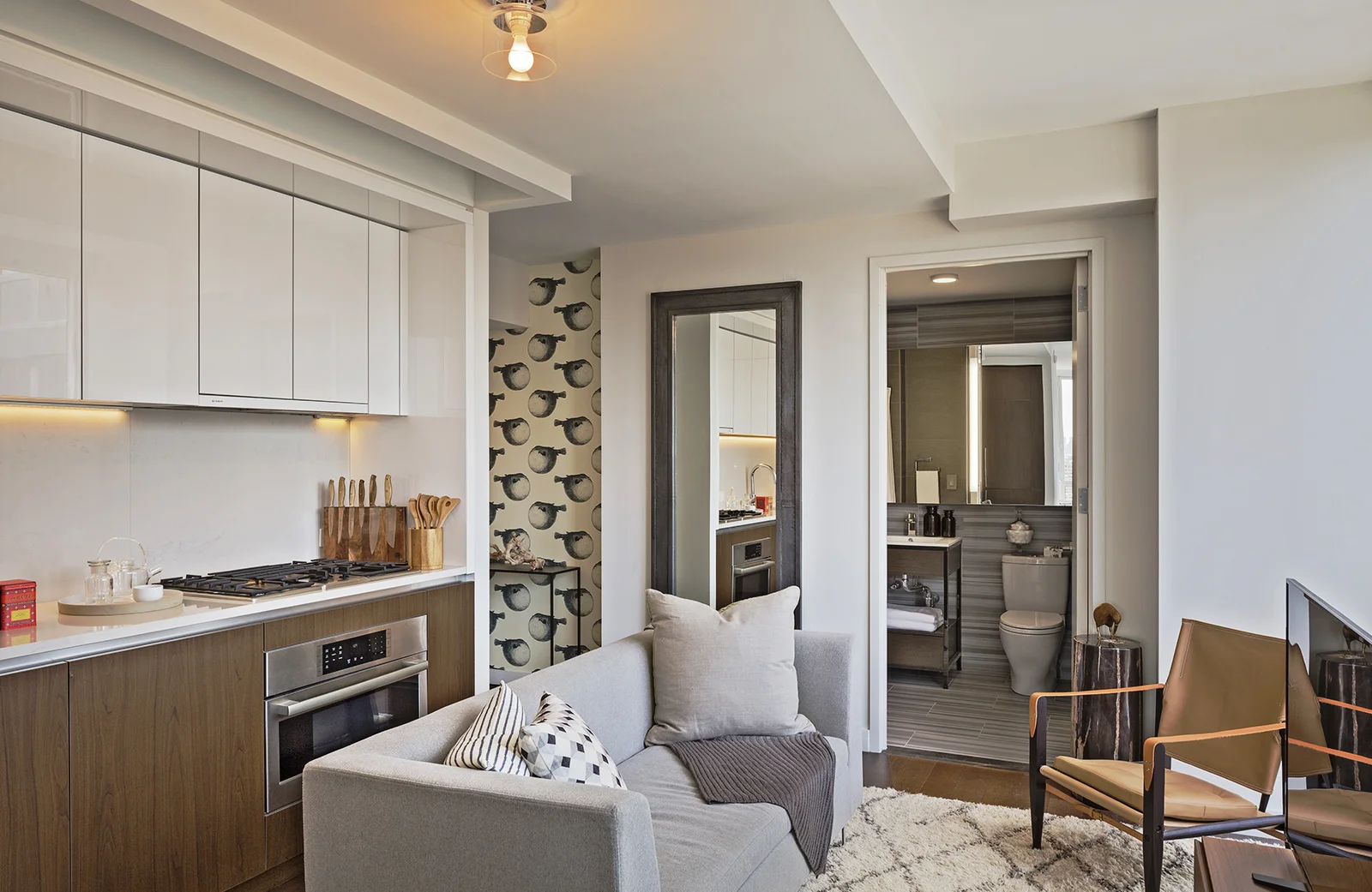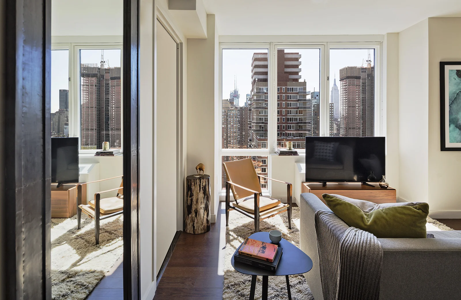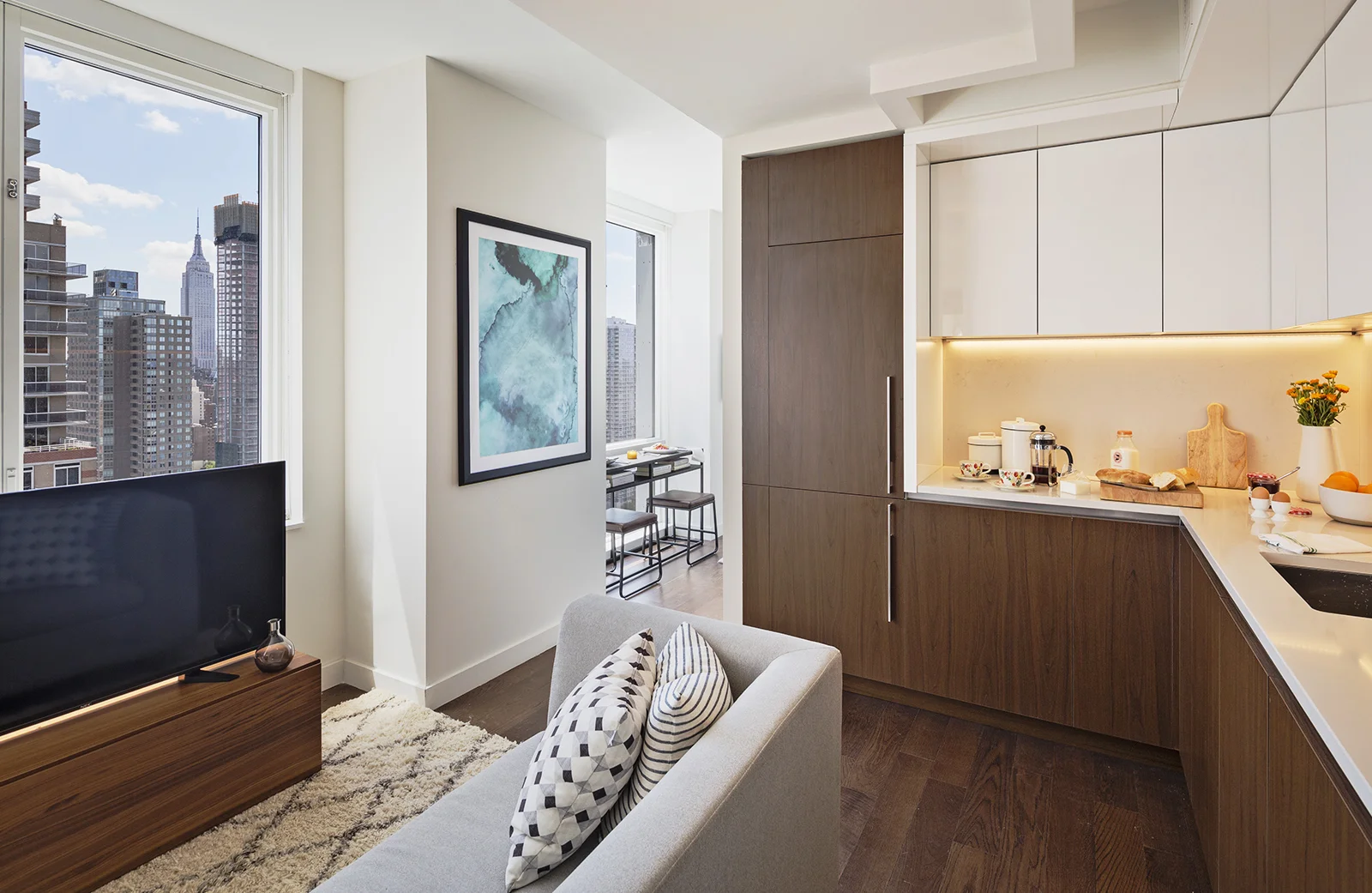The most popular unit in the building, this alcove studio has views of the Empire State Building, a large kitchen and warm-hued design to match its 'dusk' wood finishes. Much of the styling is taken from nature, with an accent wall of puffer fish, small birds hidden through out and wood furniture in its natural state.
