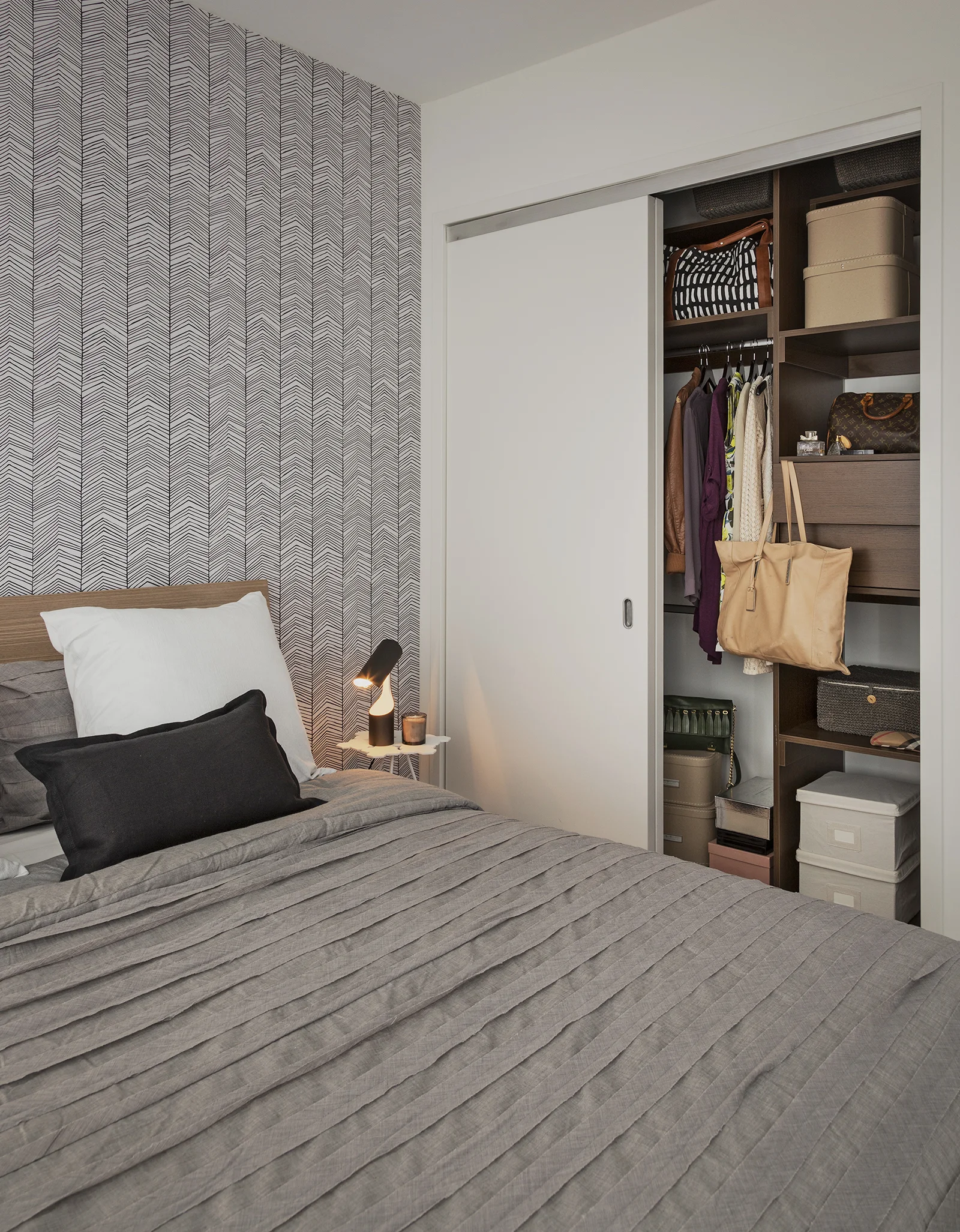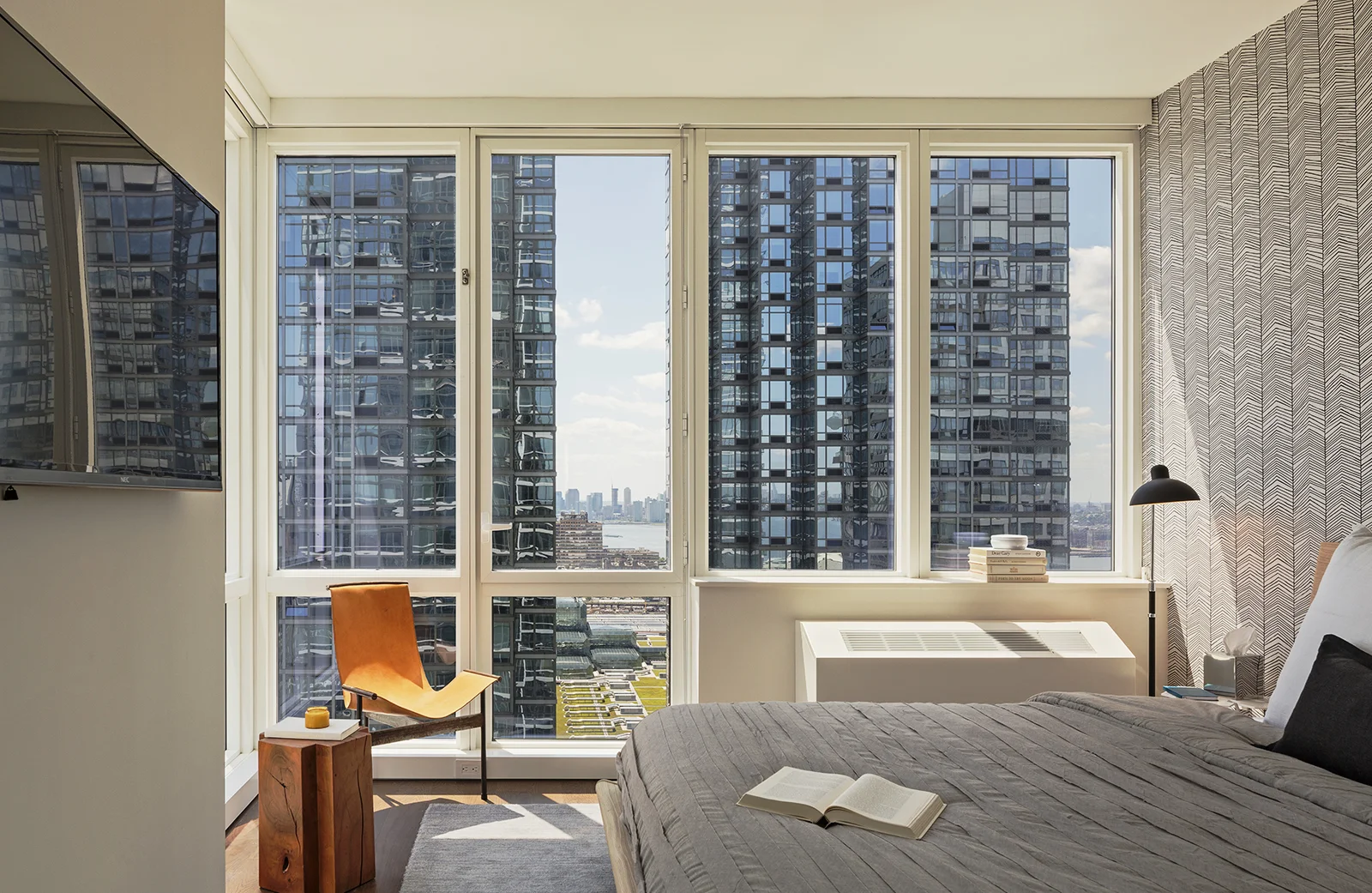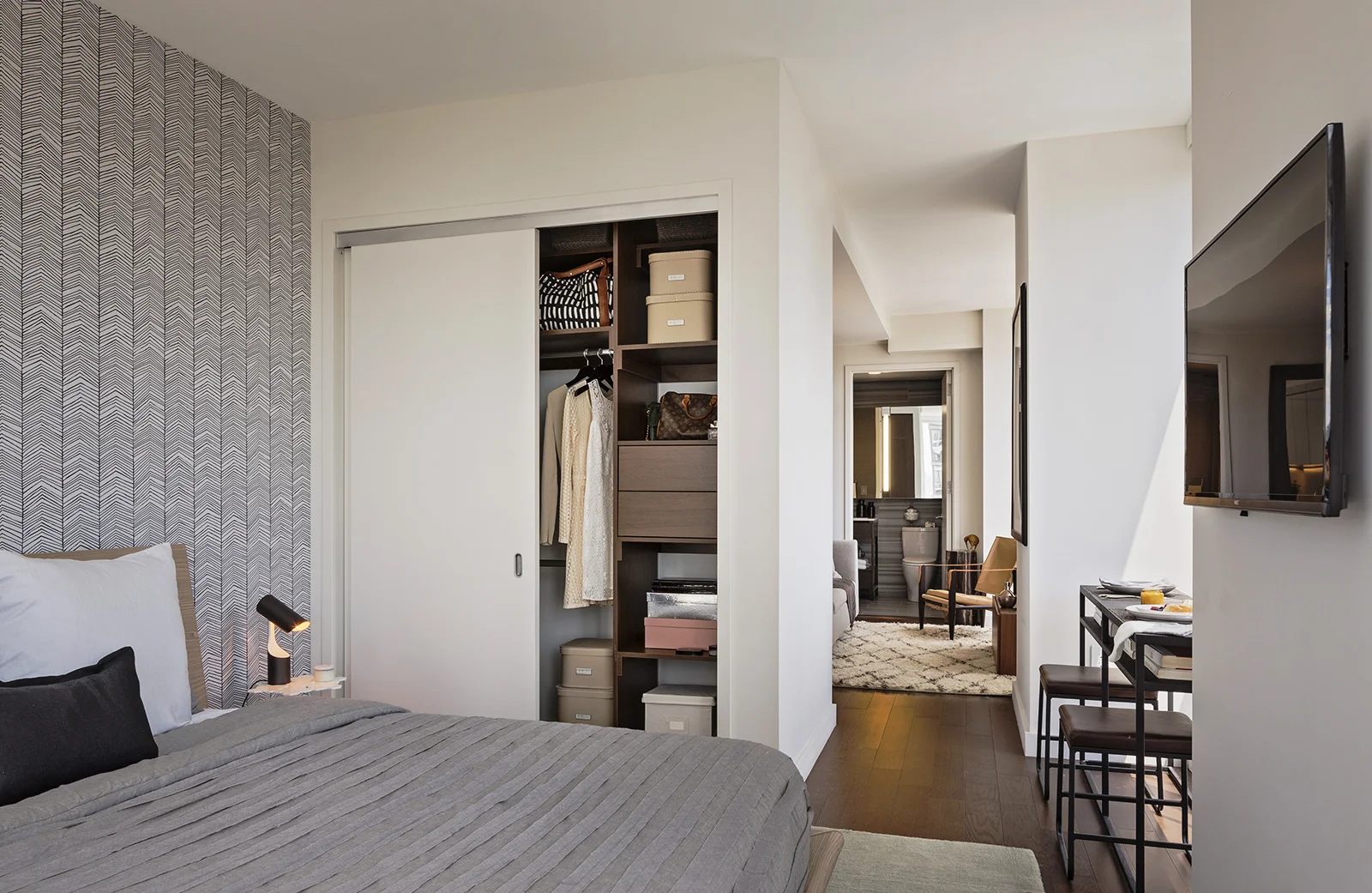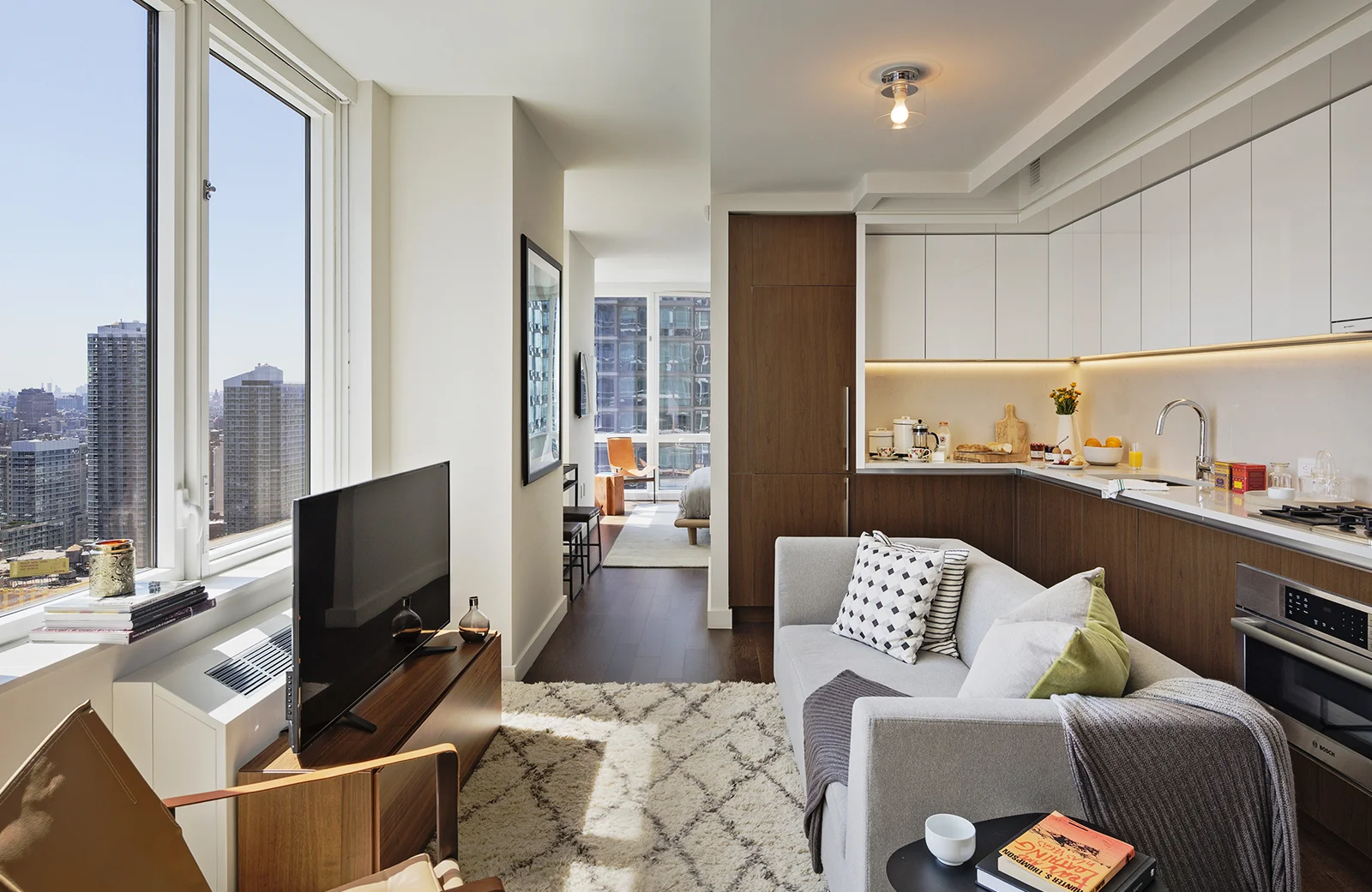 The most popular unit in the building, this alcove studio has views of the Empire State Building, a large kitchen and warm-hued design to match its 'dusk' wood finishes. Much of the styling is taken from nature, with an accent wall of puffer fish, small birds hidden through out and wood furniture in its natural state.