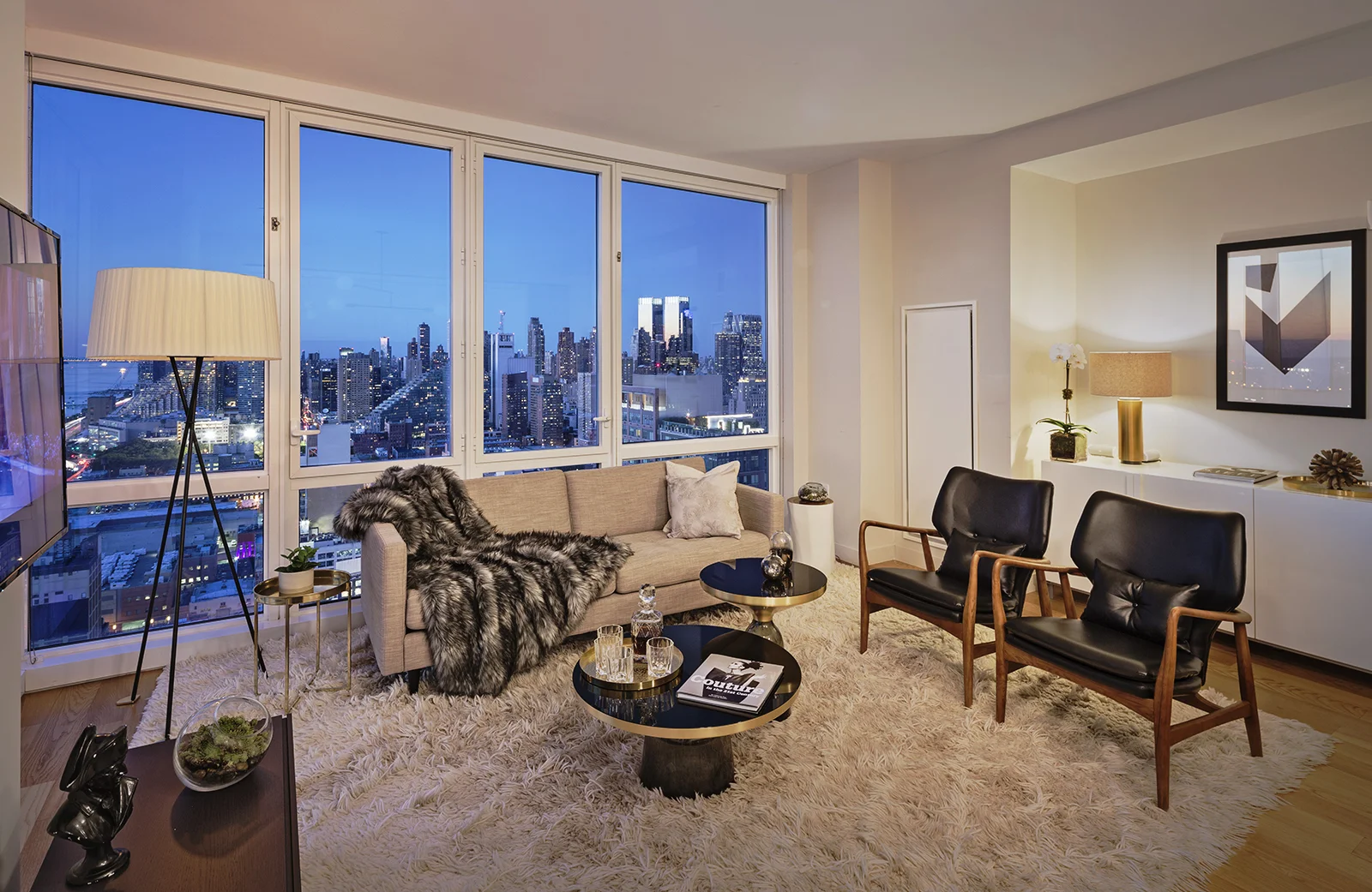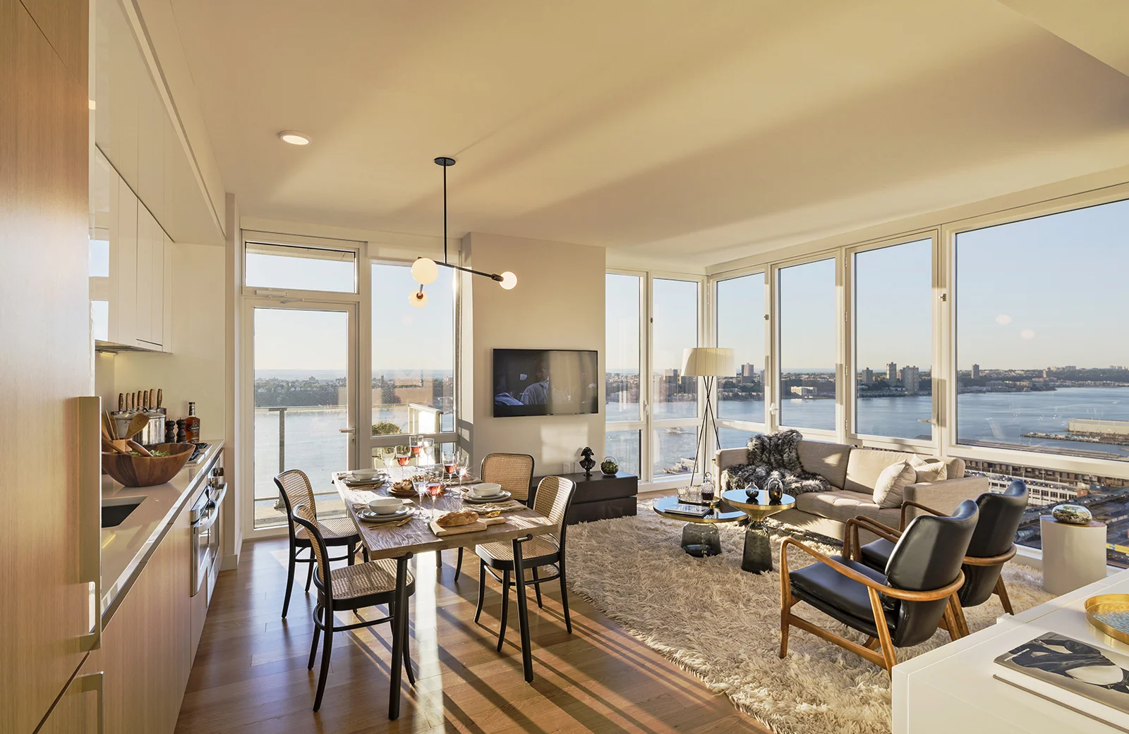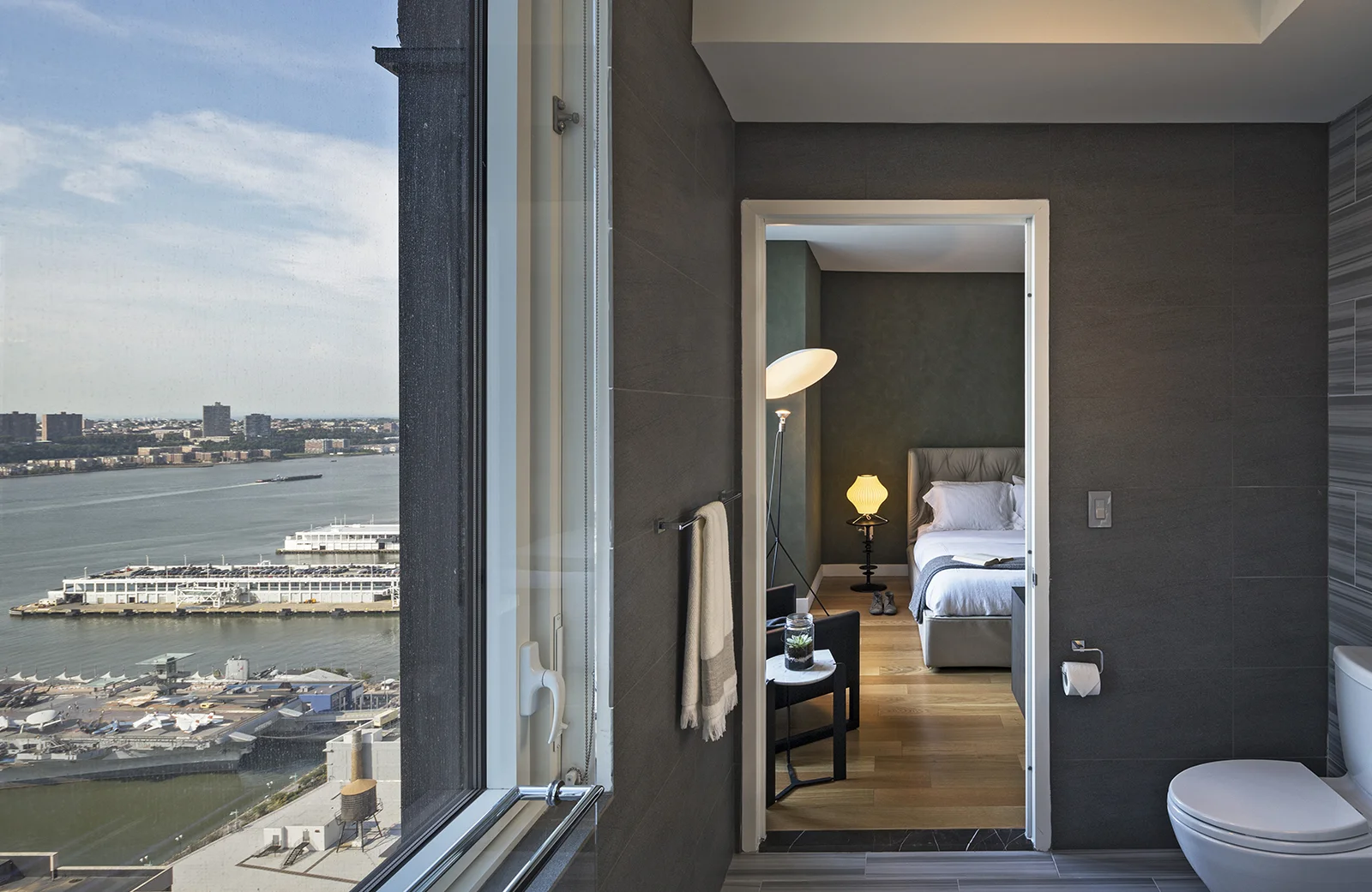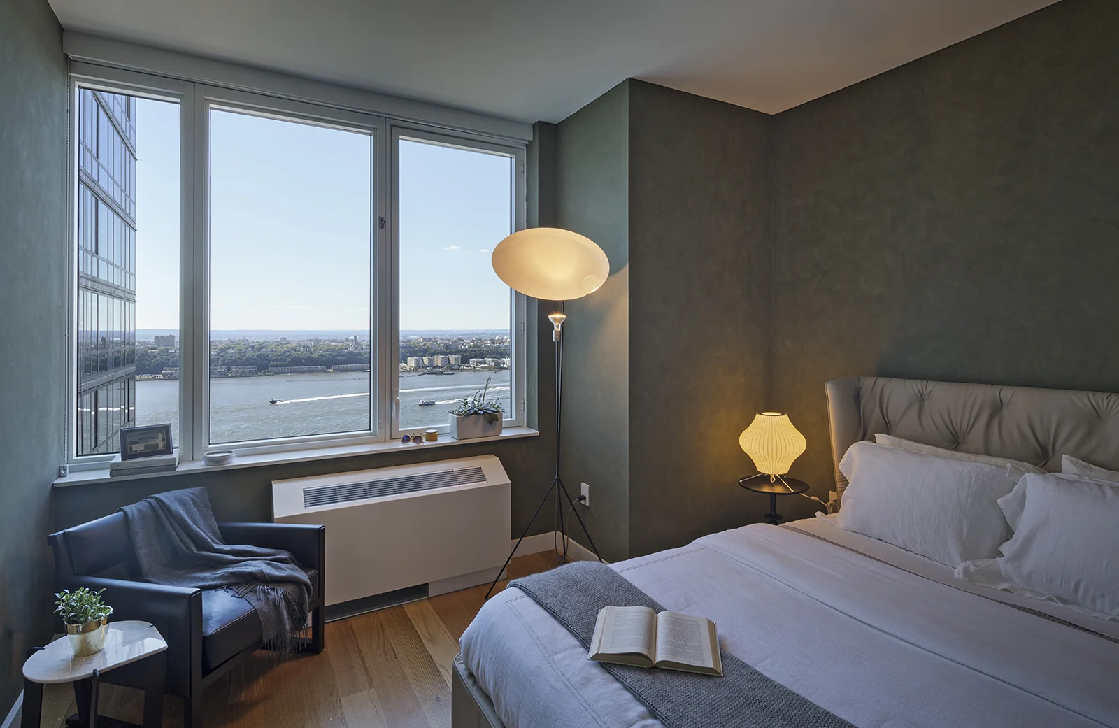 This 2 bedroom, 2 bathroom unit is done in the "Dawn" finish of light blonde oak throughout. The design reflects a green color palate and warm woods, accentuated by midcentury-modern inspired furniture. One of the most impressive features is the master bathroom view.