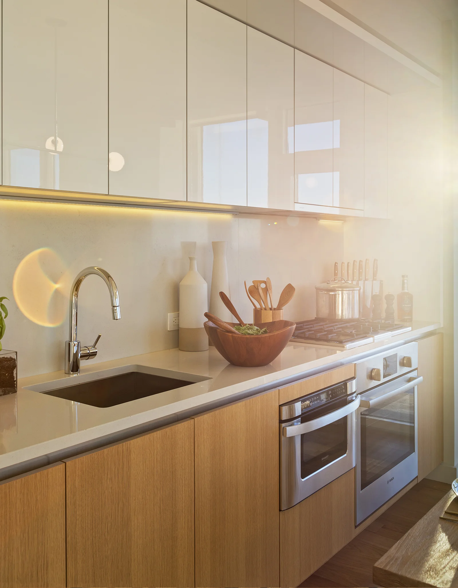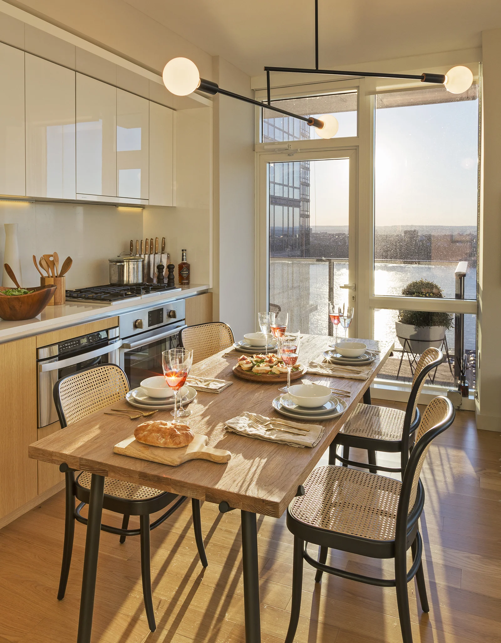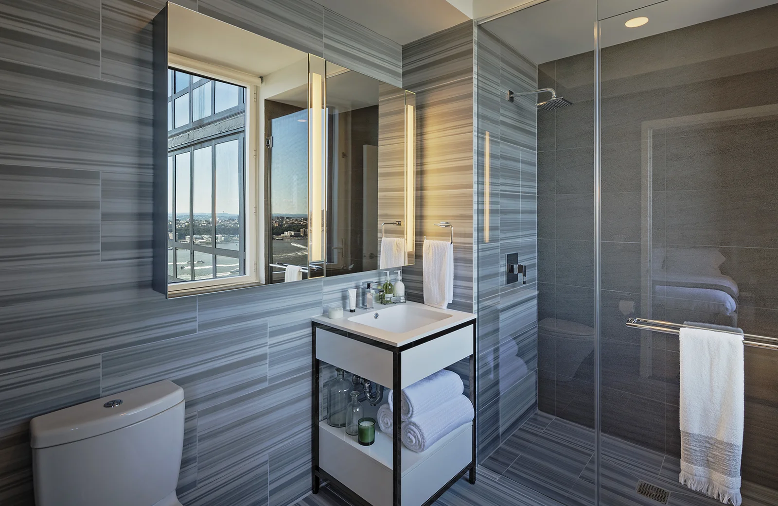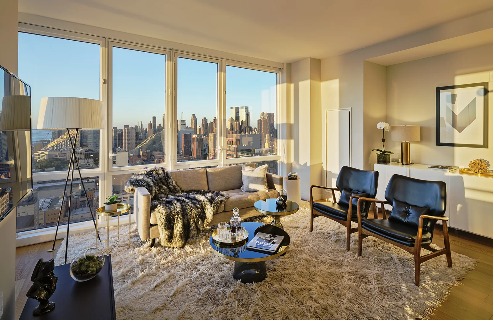 This 2 bedroom, 2 bathroom unit is done in the "Dawn" finish of light blonde oak throughout. The design reflects a green color palate and warm woods, accentuated by midcentury-modern inspired furniture. One of the most impressive features is the master bathroom view.