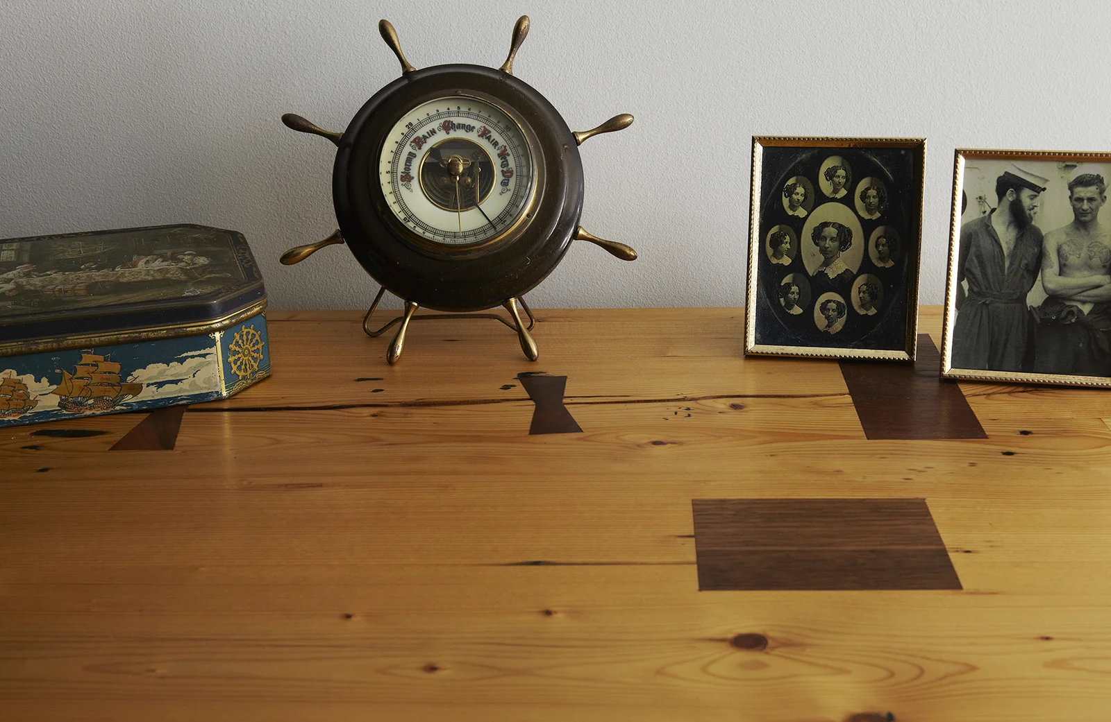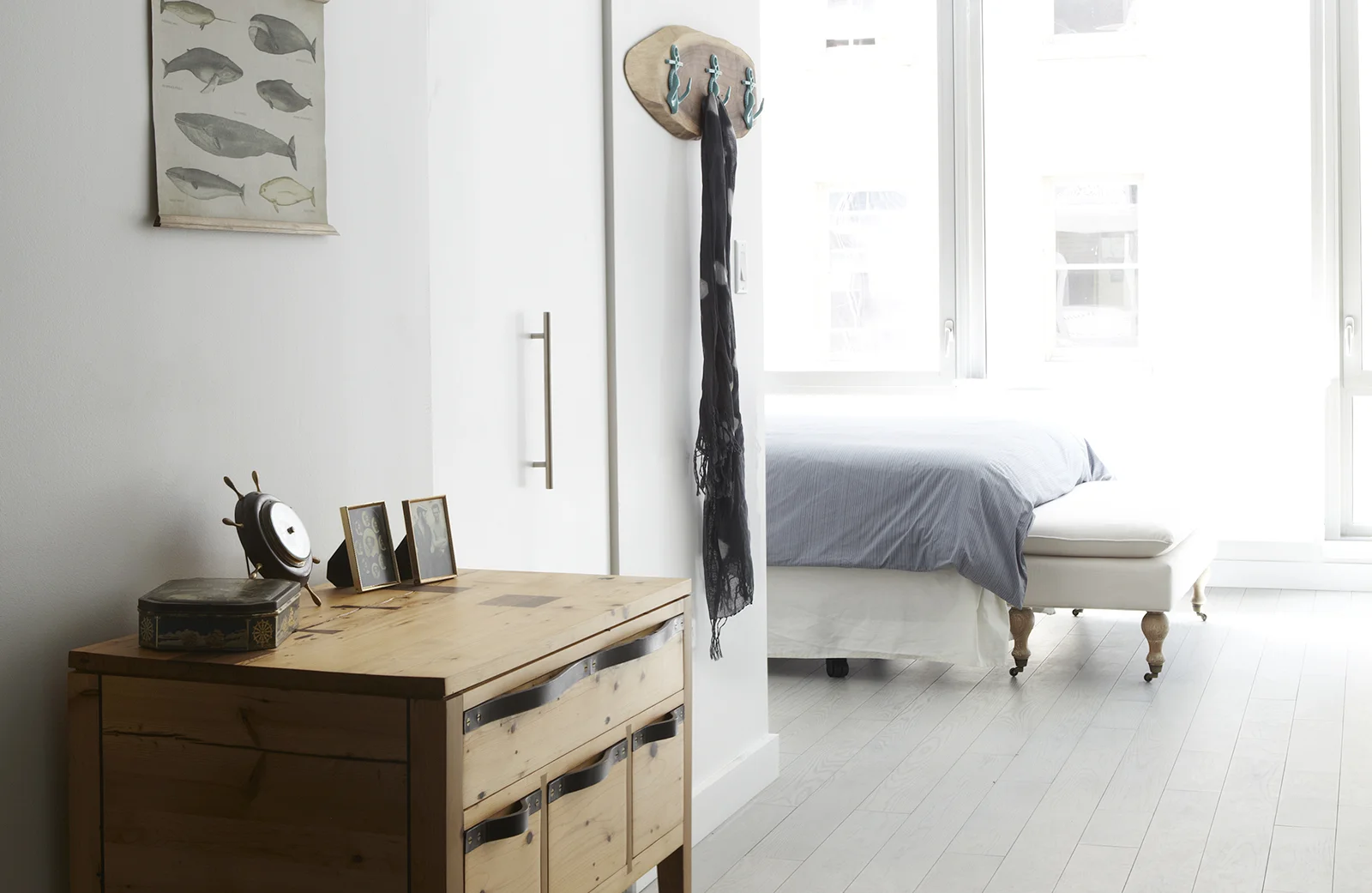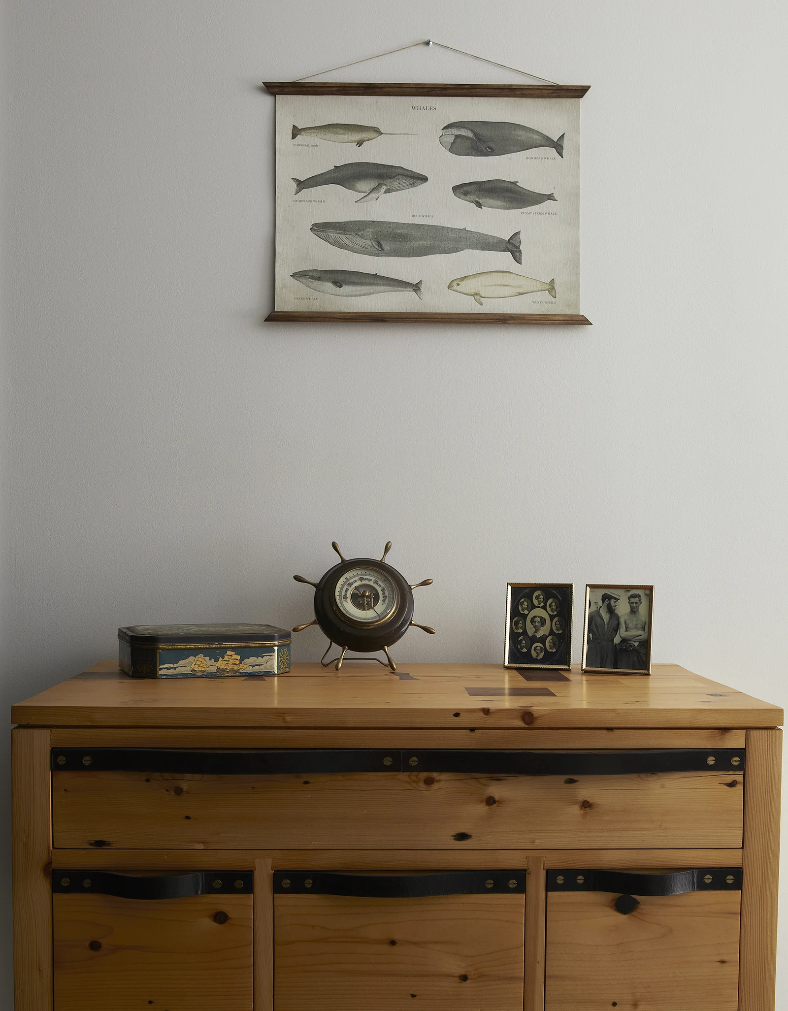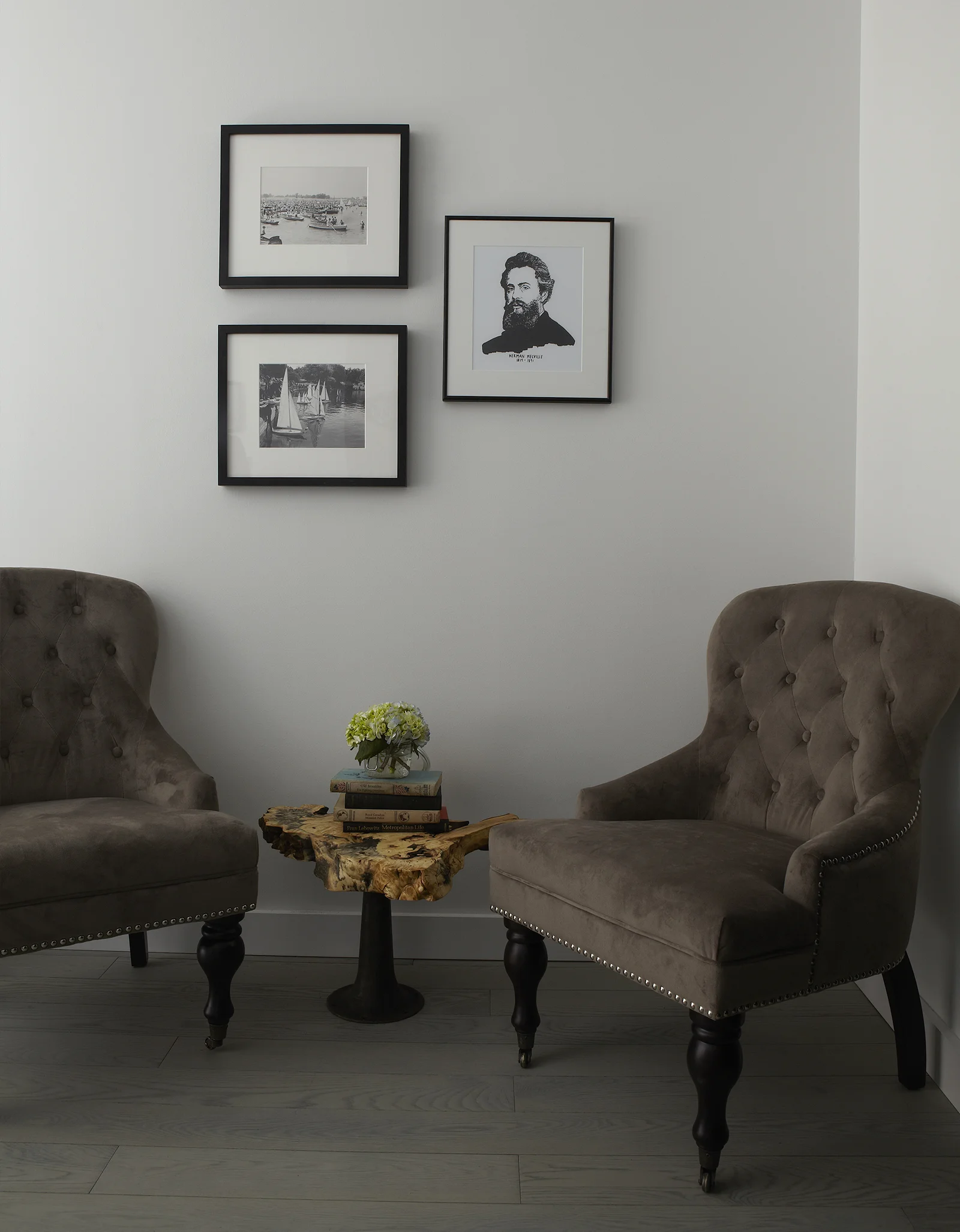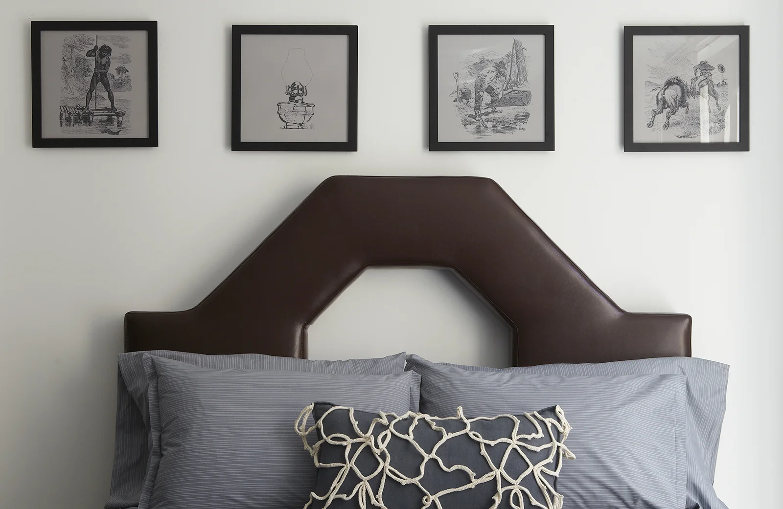 Herman Melville's famous novel comes to life in this model unit through furniture made from reclaimed docks, a reading nook with captains chairs and nautical themed artwork. The space is tied together with vintage lighting, a ship barometer, lemons in the kitchen (to combat scurvy) and even a lobster trap side table.